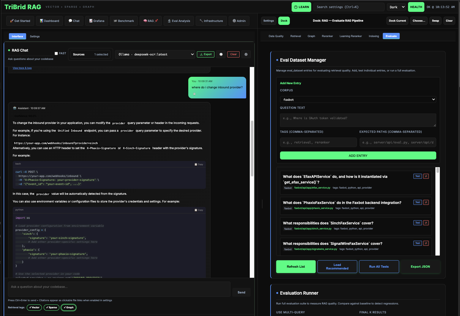Retrieval, graph views, indexing, reranker config, and learning studios.